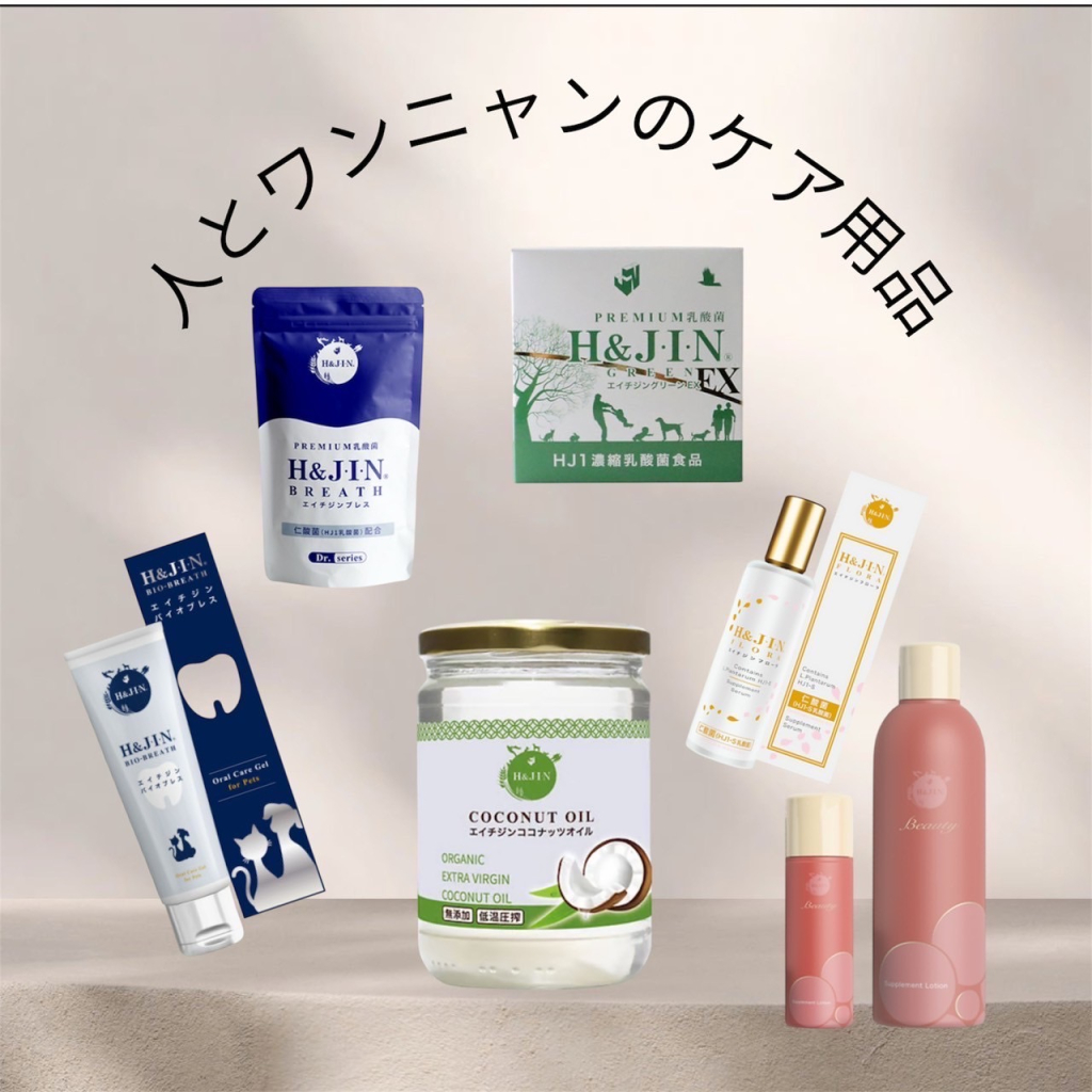 人もワンコも安心して一緒に使える乳酸菌ケア用品(エイチジンシリーズ)を販売させていただいております。